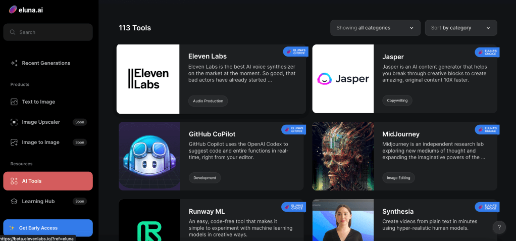 Eluna se presentan como “El recurso definitivo de las mejores herramientas de IA para potenciar tu productividad.” Pero en la actualidad es una potente plataforma de apps de IA. Al dia de hoy cuentan con un listado de 113 aplicaciones online que utilizan IA