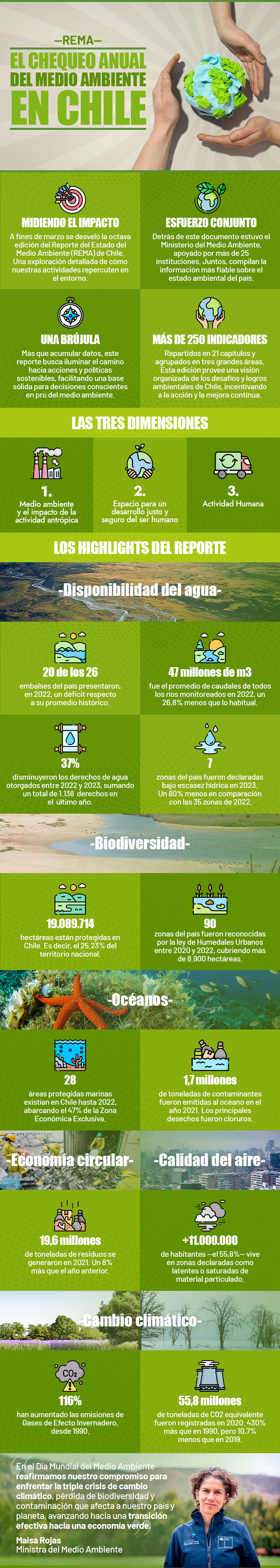 El REMA se materializa en una publicación que recoge y analiza indicadores en temáticas como biodiversidad, agua, aire, suelos, océanos, cambio climático, economía circular, entre otros, con información recolectada y validada por los distintos servicios públicos con competencia ambiental. Además, incorpora indicadores ambientales alineados con los 17 Objetivos de Desarrollo Sostenible establecidos por las Naciones Unidas en su Agenda 2030. El equipo de Emol elaboro una infografía que resume los principales temas asociados a: