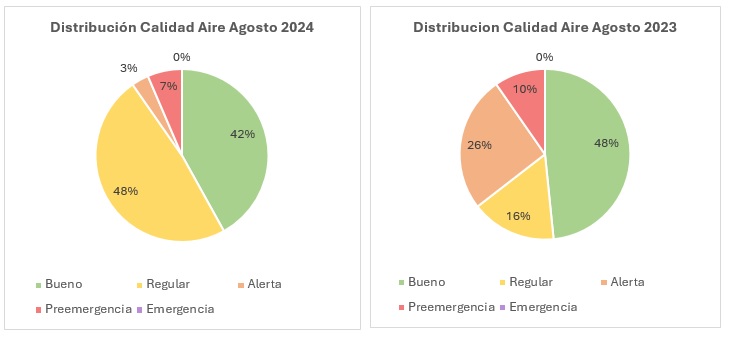 En Agosto de 2024, se registraron un total de solo 3 episodios críticos, distribuidos en 1 episodio de Alerta y 2 de pre-emergencia, sin registrarse episodios de emergencia en este mes lo que representa un 90% de días sin episodio, comparado a los 11 episodios del año 2023 para el mes de Agosto con un 64% de días sin episodio. En cuanto a concentraciones, estas se presentaron similares, con una media de 43 ug/m3 para 2024 y 44 ug/m3 para 2023, ambas por debajo de la media histórica de 50,3 ug/m3.