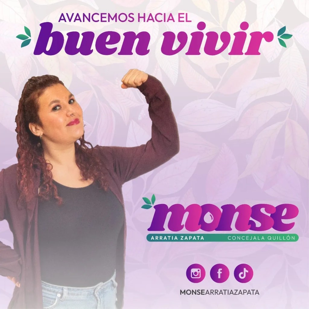 Monserrat Arratia Zapata, de 35 años, es candidata a Concejal por la comuna de Quillón. Es Fotógrafa periodística y actualmente se encuentra soltera. Entre sus hobbies se encuentra bordar, leer, escribir y bailar.