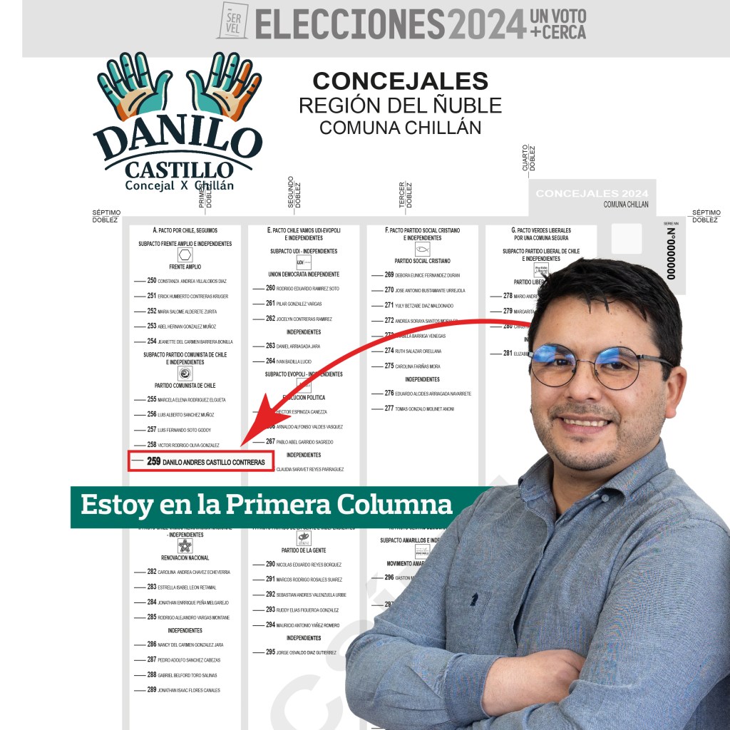 Danilo Andrés Castillo Contreras, de 36 años, es candidato a concejal por Chillán. Es Trabajador Social de Profesión y actualmente se encuentra soltero. Sostiene que entre sus hobbies está patinar, jardinear, cocinar y escuchar música.