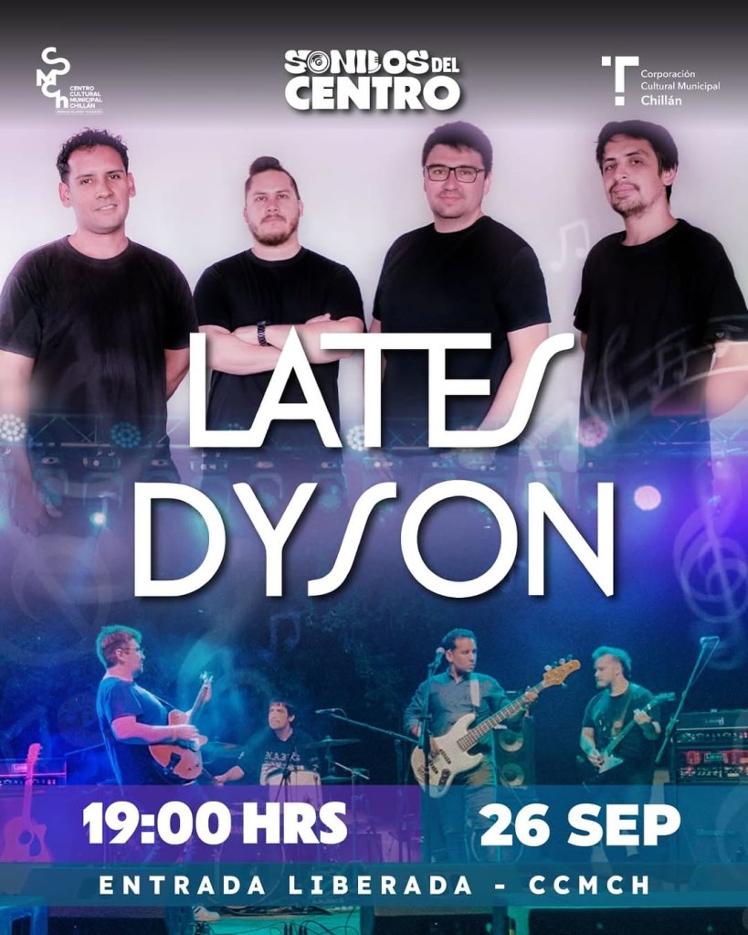 - La banda chillaneja Lates Dyson anuncia su participación en una nueva edición del ciclo “Sonidos del Centro”, organizado por el Centro Cultural Municipal de Chillán. La cita será este viernes 26 de septiembre a las 19:00 horas, en Sala 6, tercer piso, ubicada en Herminda Martín 57, detrás del Teatro Municipal de Chillán.